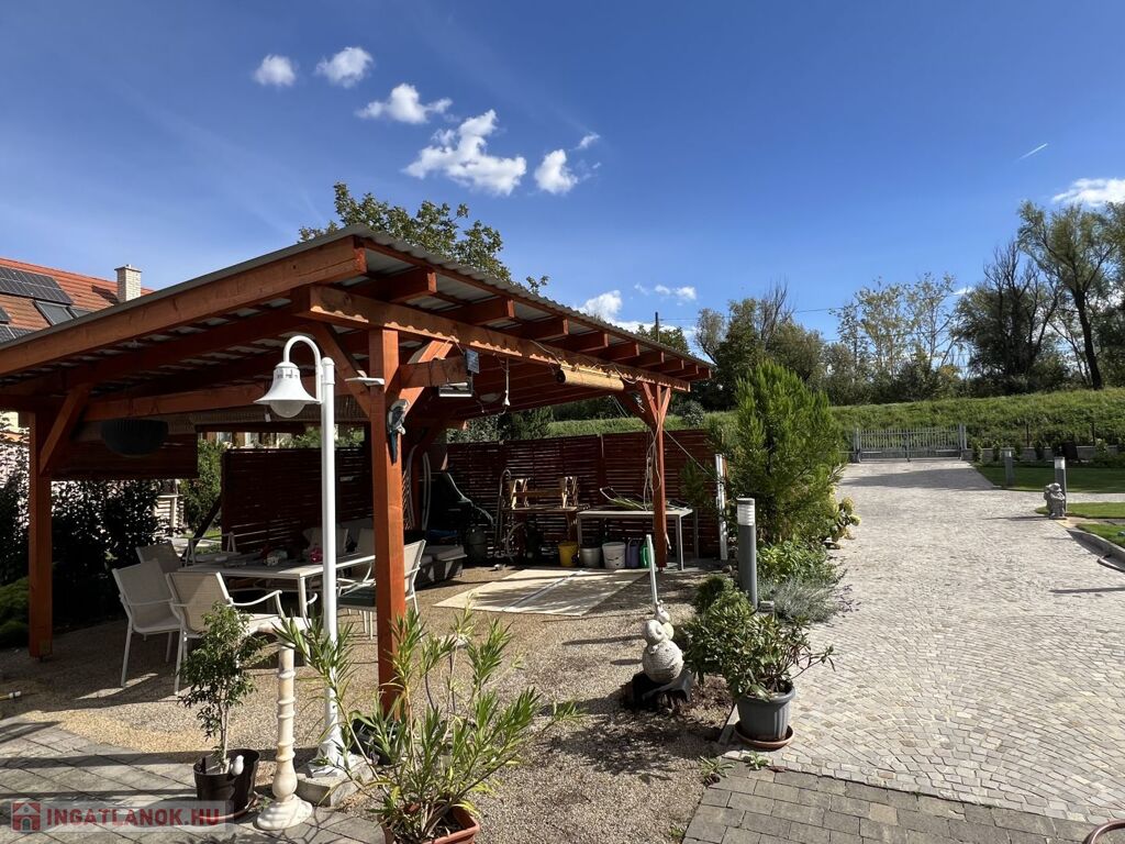 Az udvaron helyett kapott egy fa szerkezetű, fedett pergola, mely a mindennapok és a társas összejövetelek kényelmét szolgála.