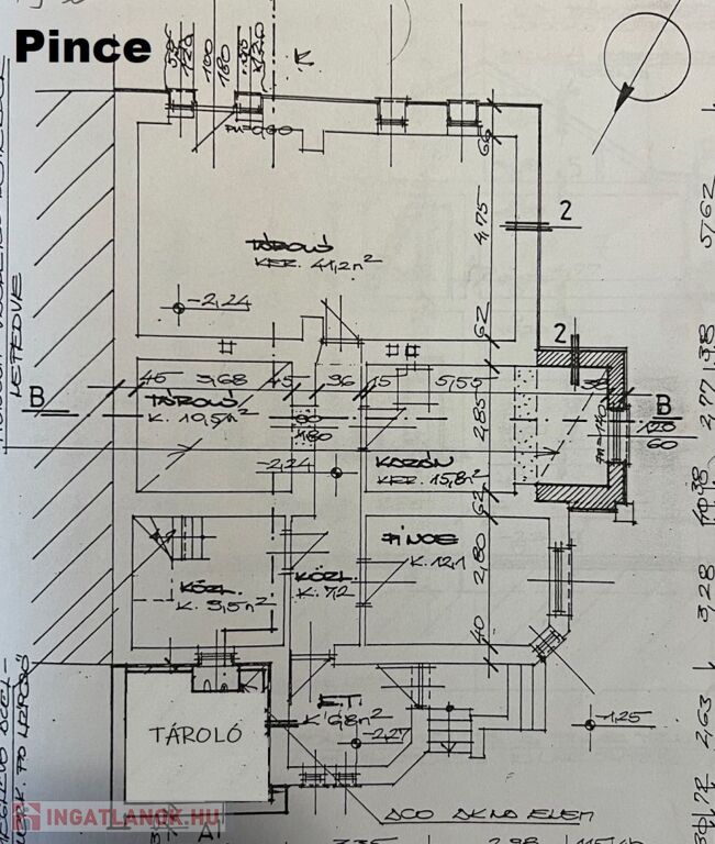 A 113 m2-es pince szinten jelenleg tágas tároló helyiségeken kívül a kazánház és a mosókonyha található. A szint belmagassága 200 cm. Így party helyiség, kondi terem, barkács műhely funkcióknak is tud helyet kínálni. A pince szint az udvar felől két irányból is megközelíthető.