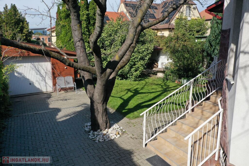 Az épület földszinti (magasföldszinti), kert felé néző, hangulatos teraszára, 9 lépcsőn keresztül érkezünk.