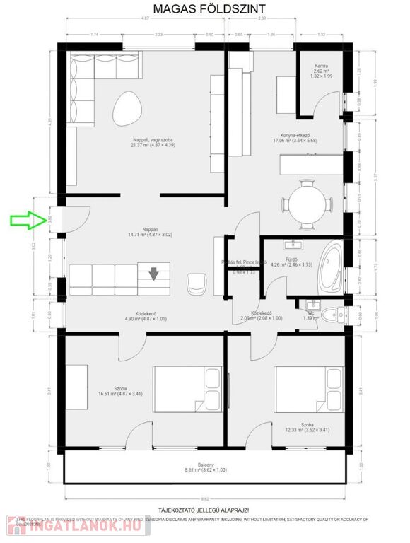 A konyha mellett található egy praktikus méretű kamra, valamint a hat fő részére étkező.