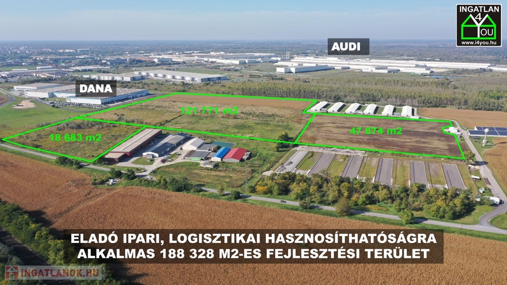 Győr, Ipari Parkban, az AUDI szomszédságában, 188.328 m2-es, Gipe (ipari) övezetben található terület eladó.