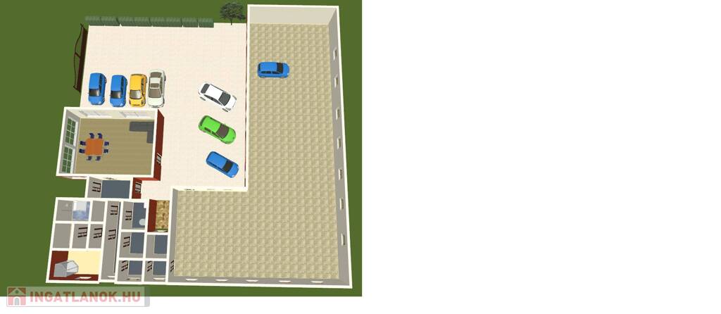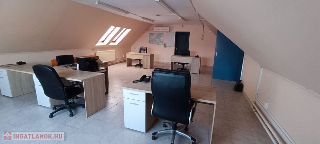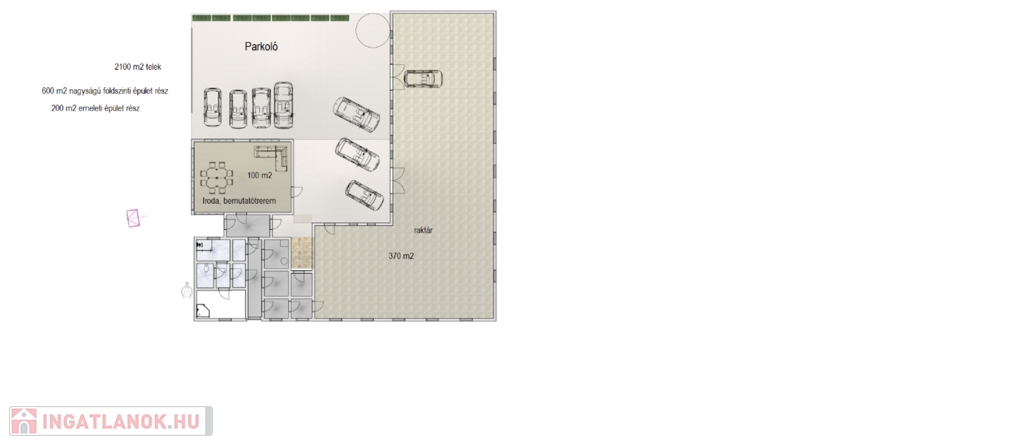 A földszinti részen egy 100 m2-es irodát/bemutatótermet, szociális helyiségeket és egy 360 m2-es fűtött raktárt/üzemrészt találunk.