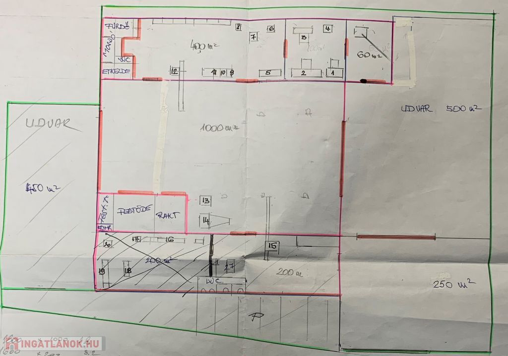 Gyártásra alkalmas, fűthető csarnok rész mérete 860m2, a belmagassága 3,2-3,6m közötti.