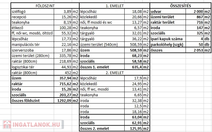 A 2 053 m2-es felépítmény földszinti részén a dolgozók kiszolgálását biztosító szociális helyiségek találhatóak, aminek egy része igény szerint irodaként, tárgyalóként is használható. A földszint nagyobb részét pedig 6 t/m2 padlóterhelhetőségű 2,8 m belmagasságú 335 m2-es, ESD padlóval ellátott gyártó, valamint a szintén 6 t/m2 padlóterhelhetőségű 8 m belmagasságú 716 m2-es raktár csarnok foglalja el. A földszint a személyi bejáratokon kívül 2 db, 4m x 4,5m-es szintbeni szekcionált Hörmann ipari kapun keresztül közelíthető meg.