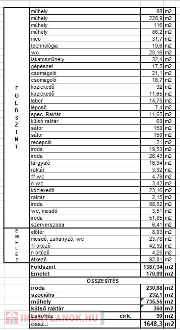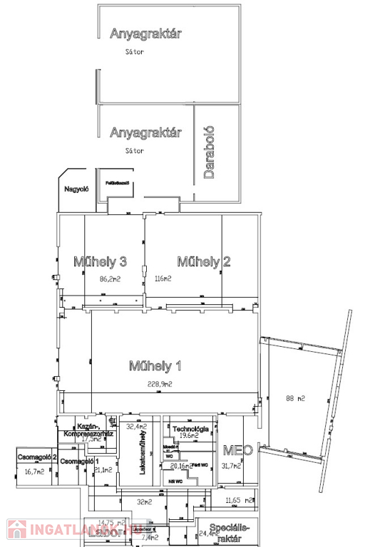Az ~755 m2-es üzemcsarnokból, cirk 20 m-en találhatók a wc-k, mosdók, a fennmaradó ~735 m2, ~3,4 m belmagasságú rész termelésre, raktározásra alkalmas. További tárolási lehetőséget kínál a két darab 150 m2-es sátor és egy acél szerkezetű 60 m2-es tároló.