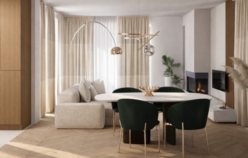 Az egyszintes elrendezés egyszerű és jól áttekinthető közlekedést biztosít. A lakótér központi része a nappali, amely közvetlen kapcsolatban áll az étkezővel és a konyhával, így egy jól használható, világos közösségi zóna jön létre. Ez a megoldás ideális a családi élethez, valamint a mindennapi együttlétekhez.